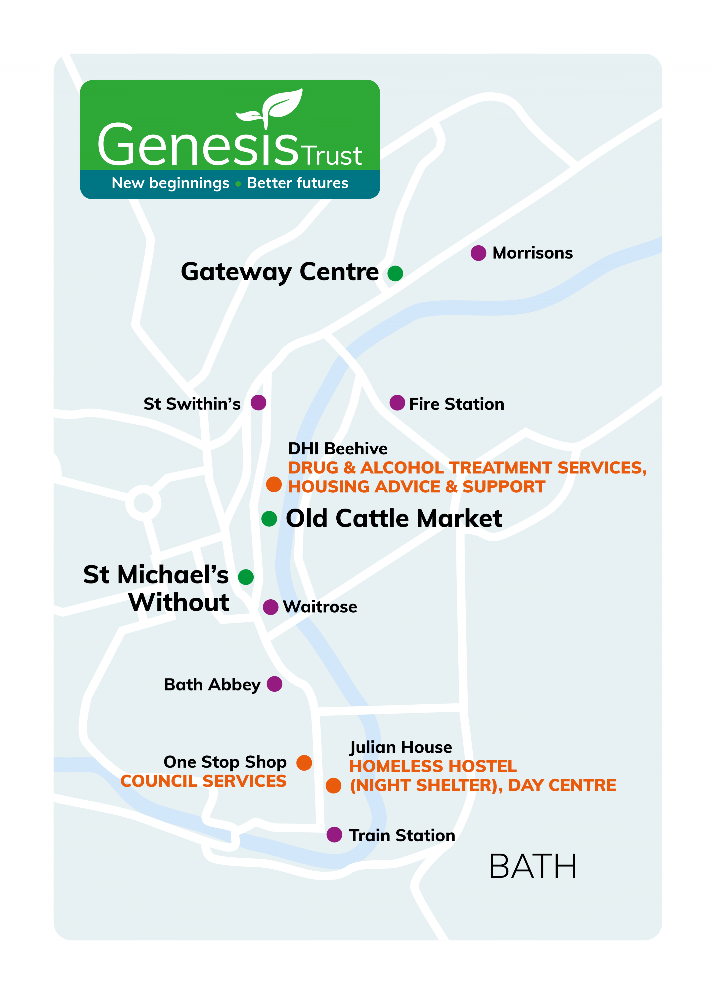 We have had flooding at our Gateway Centre on London Road and the building is closed. We now have temporary premises for Genesis Life Projects at the back of Widcombe Baptist Church. This includes Lifeline (our day centre) and all of our other projects.