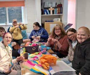 Our colourful knitting blanket is the focus during the knitting group, and it’s laid over the table during every knitting session. Every client who walks in comments on how it gives such a warm glow to the space. Over the last few years, hundreds of small squares have been knitted and joined together by the knitting group to create this colourful blanket. It was a shared project and a challenge to overcome for many of the participants. And now it’s a beautiful feature to have pride in. We are very careful not to spill our coffee on it.
