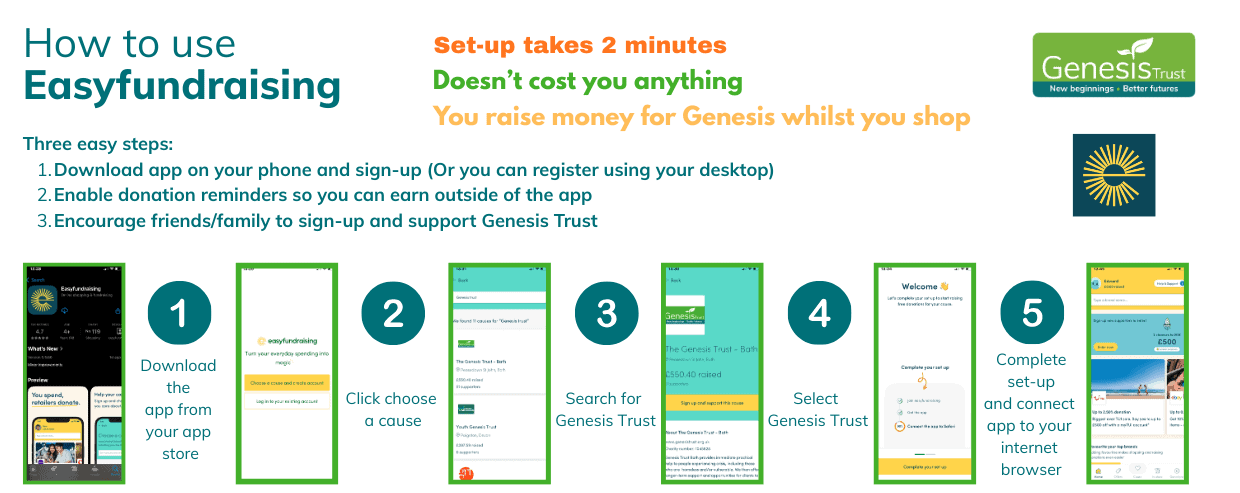 We can collect donations every time you shop online – at no coast to you! Easyfundraising is a website and app that turns everyday shopping into free donations for Genesis Trust.  The app lets you raise free donations with about 4,000 retailers every time you do your online shopping.  Simply open the app, find the retailer you want to shop with, then shop as normal.  When you check out, the retailer gives Genesis Trust a free donation – at no cost to you!